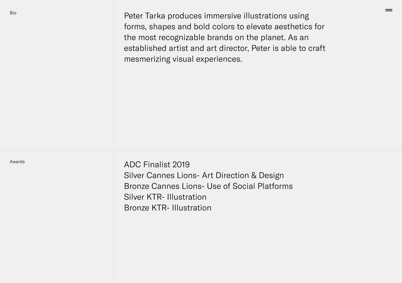 To emphasize the core of Peter’s approach, which focuses on minimalistic, isometric 3D illustrations with central composition, the website design uses transparent videos over a minimal interface creating an interactive canvas on which Peter's work is rendered.